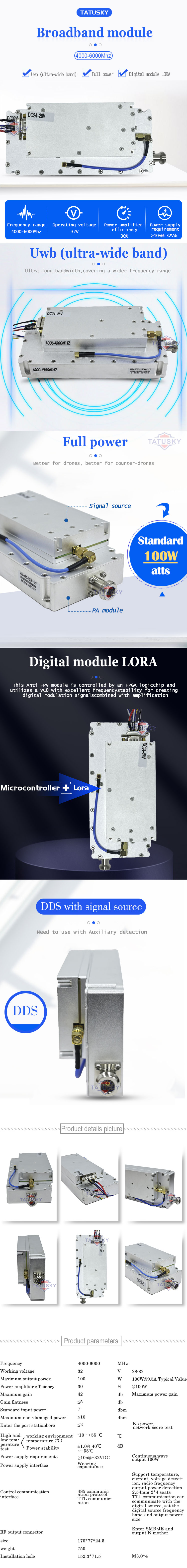 This 4000-6000MHz GaN anti-drone amplifier module is designed for drone jamming and countermeasure applications using gallium nitride (GaN) technology with high power, high efficiency, and wide frequency band coverage.